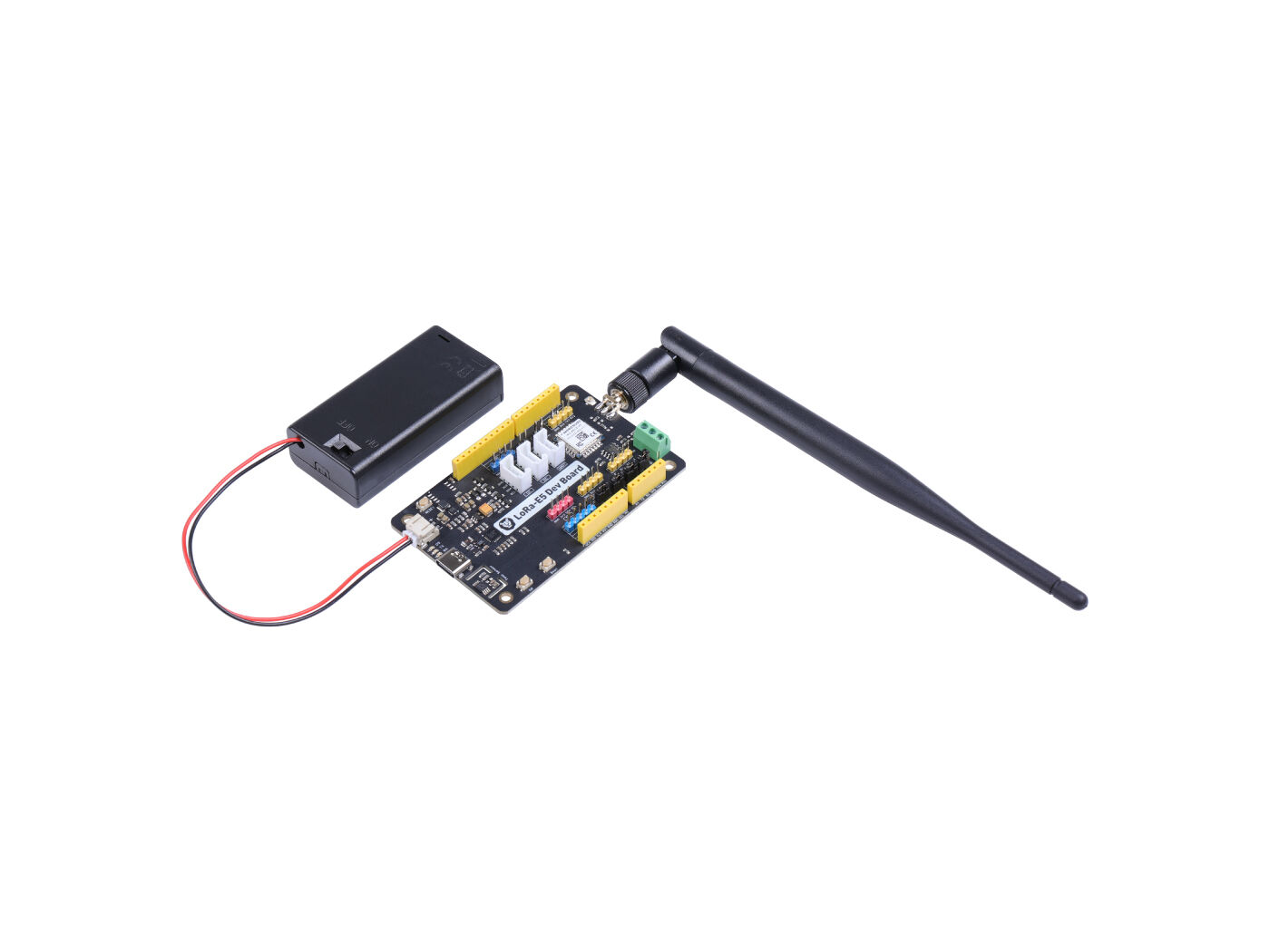 Wio-E5-LE Dev Kit features ultra-long range transmission, extremely low chip power draw, and user-friendly interfaces. Designed to unlock the Wio-E5-LE module's full capabilities, it provides access to all 28 pins and abundant connectivity options including Grove connectors, RS485, and male/female pin headers. This allows connecting sensors and modules with various connectors and data protocols without wire soldering, saving development time. The kit can also be easily powered using the on-board battery holder with 2 AA batteries, enabling temporary use without an external power source. With its versatile connectivity and ease of use, the Wio-E5-LE Dev Kit enables rapid testing and prototyping.