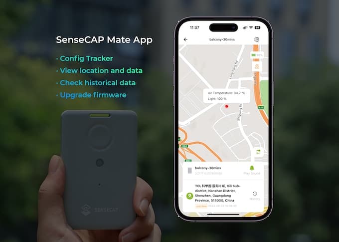 SenseCAP Mate App provides an easy hands-on experience with T1000, you can set up and configure the tracker's parameters, like enabling built-in sensors, changing data uplink interval, and viewing the latest and historical locations.